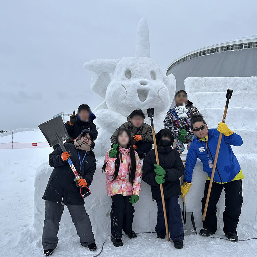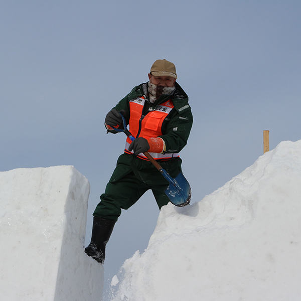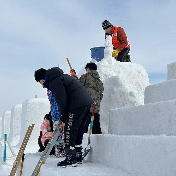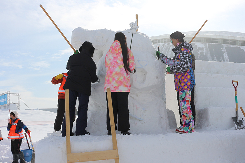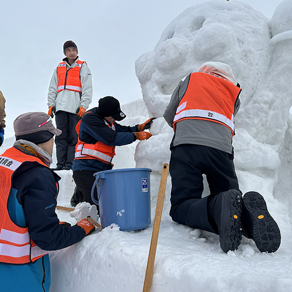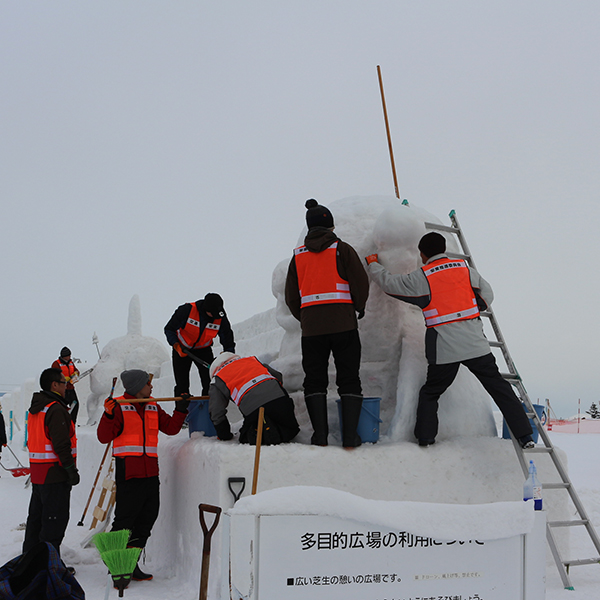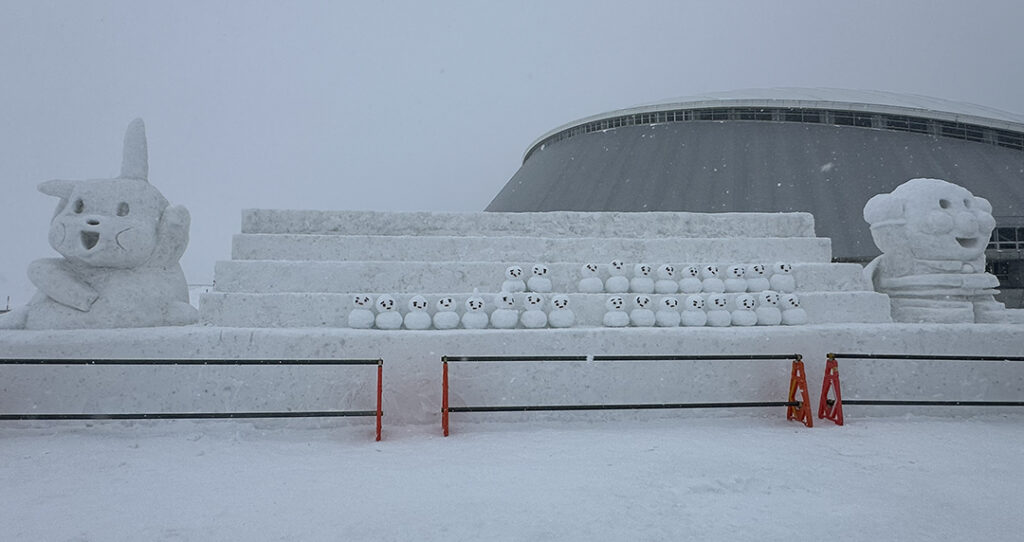 この日の参加者は、36名余り。それぞれの5時間余りの作業を終えました。2月3日には、100基余りの雪だるまと精密な削りや肉付けで表情豊かなアンパンマンとピカチュウに磨き上げ、来場客を温かく迎えるウエルカム雪像が完成です。